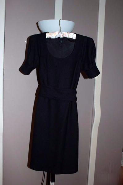 Черное платье фирмы benetton с длинным поясом, можно одевать и без него. Прямого покроя. Платье одевала считанные разы, даже ни разу не стирала. Точный размер не помню, XS или S. Носила когда весила 49 кг. Сейчас, после родов я вешу 55 кг, платье тоже можно одеть, но мне не нравится как сейчас сидит. При росте 165 , платье чуть-чуть выше колен. Покупала намного дороже. Состав платья не знаю, но оно тепленькое. Есть подкладка.