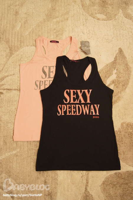 1 шт. размер М (44) цвет чайной розы с надписью серыми пайетками; 1 шт. размер М (44) цвет черный с надписью розовыми пайетками.
