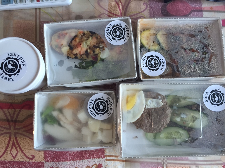 Обед - бифштекс (приличный такой, 1,5 см толщиной), гречка, яйцо и огурец. Вкусно и сытно.