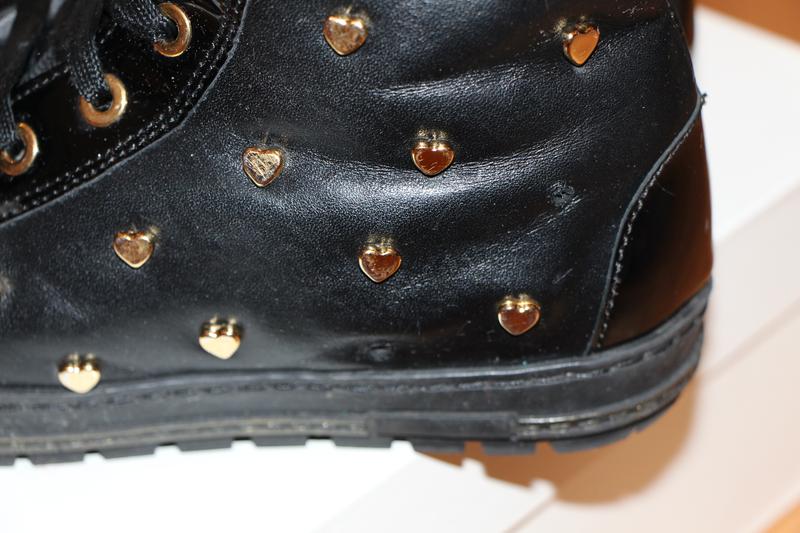 Cherie 32р. На шерсти, подошва 22см. стелька соответственно 21-21,5см. Состояние хорошее, только не хватает 3-х сердечек (смотрите фото ниже) и микро царапки на носу, которые видно если только к носу поднесешь. В остальном состояние отличное, без заломов и царапок. В комплекте есть запасные шнурки.