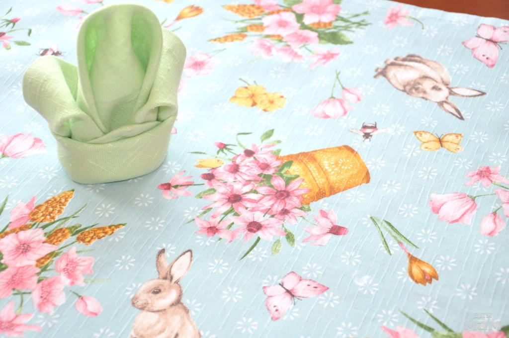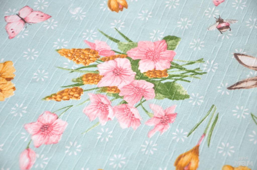 Глубокий светло-голубой цвет скатерти с нежными цветами, бабочками и забавными кроликами (а может и зайчиками, но больше похожими на кроликов) вызовет улыбку на Вашем лице. Ткань плотная, хорошо держит форму. Разнообразие красок на ней так велико, что не составит труда подобрать к ней салфетки и посуду.