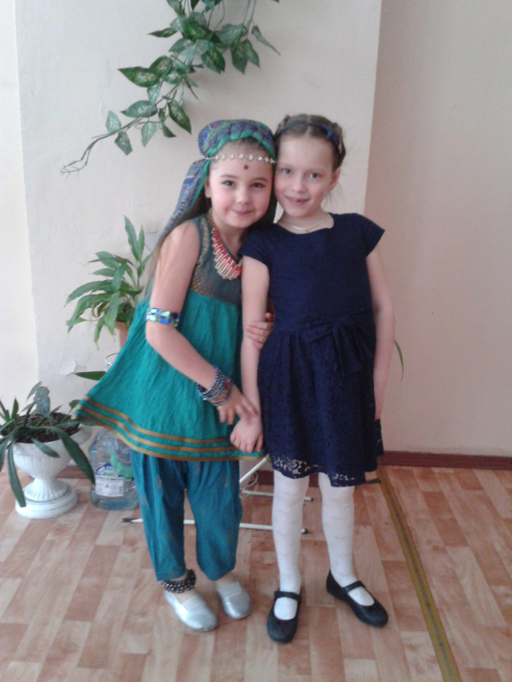 перед Новым годом у нас в школе проводился конкурс "Минута славы". Настя у меня решила выступить в танцевальном жанре. танец был индийским. Скажу сразу, что на танцы мы не ходим и никак ими профессионально не занимаемся. Поскольку маленькая наша танцевала такой же (попроще) на утреннике в саду Деду (он был, конечно, в шоке...))), а Настя с ней много репетировала и тоже хотела станцевать, поэтому решено было выступить именно с ним. Танец она сама придумала (я помогла чуть-чуть...). Ютуб был затерт до дыр)))... СПАСИБО Женечке за костюм!!! пригодился и старшей:))