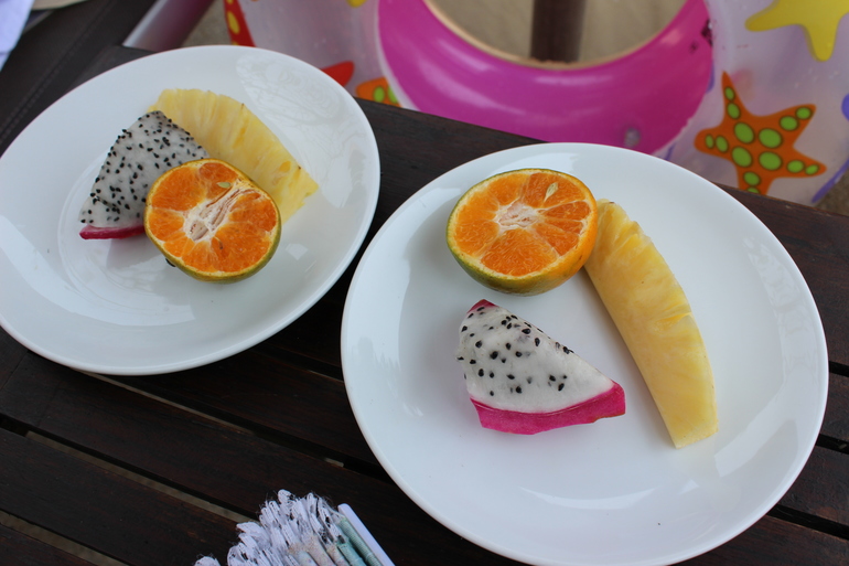 Из фруктов нам понравились манго (желтые) , ананасы (совсем не такие как у нас) и маленькие бананы. Все остальное не по нашему вкусу оказалось... а вот девочкам еще этот фрукт понравился, но как называется, не знаем(