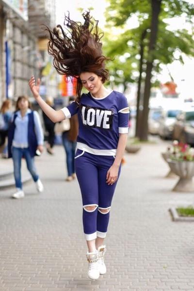 Костюм двойка из "двунитки" Длина блузы по центру спинки - 65 см., длина рукава от горловины - 30 см., длина лосин по боковому шву - 102 см.Размеры:42-44 (M); 46-48 (L); 50-52 (XL).