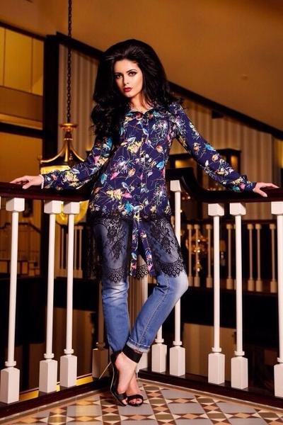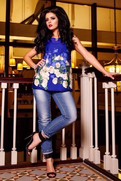 Костюм состоящий из туники "обманки" и брючек из стрейч джинсы.Туника выполнена из креп шифона и тончайшей "двунитки".Длина брюк по боковому шву - 106 см., длина блузы по центру спинки - 63 см.Размеры:42-44 (M); 46-48