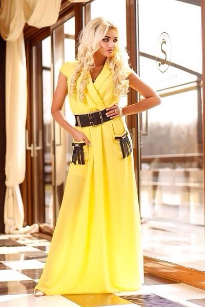 Креп шифон.Декорировано объемными кармашками и фурнитурой под "кожу" и "золото". Пояс не входит в комплект. Платье на подкладе.Длина изделия по центру спинки - 152 см.Размеры:42-44 (M); 46-48 (L); 50-52 (XL).