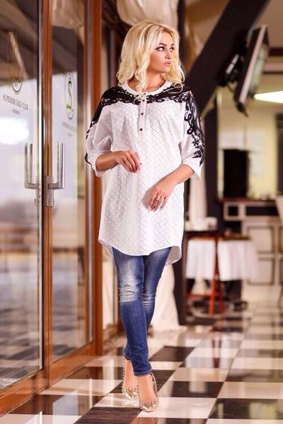 Состав: Шифон+ гипюр.Длина изделия по центру спинки до кружева - 69 см., с кружевом - 87 см., длина рукава от горловины - 48 см.Рост модели на фото 170 см. Размеры:42-44 (M); 46-48 (L); 50-52 (XL).