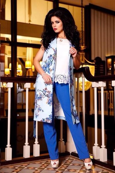 Длина блузы по центру синки - 95 см., длина рукава - 24 см., длина брюк по внешнему шву - 92 см.Рост модели на фото 170 см. Размеры: 46-48 (L); 50-52 (XL); 54-56 (XXL)