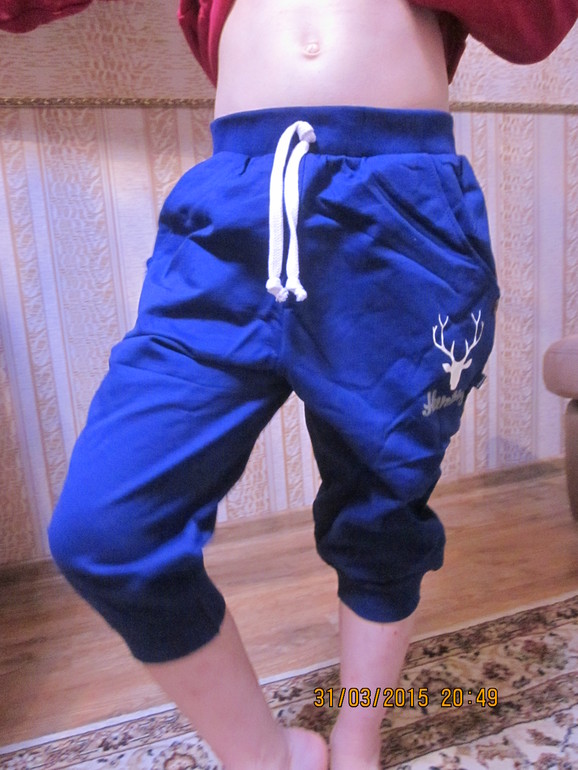 Бриджи р-р 98. Тонкие, подойдут на самую жару, резинка широкая, хорошо тянется, удобные. До последнего сомневалась в этом цвете для мальчика, но шикарная надпись на попе взяла надо мной верх. Не жалею что взяла, они классные!!! Футболка наша, не из закупки