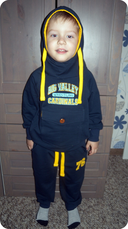 Костюм р-р 104, запас как раз до самых холодов осенних есть, резинку внизу кофты подвернула, чтобы штаны было лучше видно, так что кофта длиннее на целый манжет :)