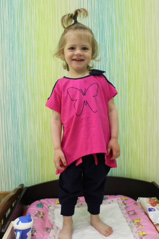 Комплект с юбкой, футболку с котом и голубую толстовку можно уже носить, запас совсем небольшой. Леггинсы с запасом. Малиновый комплект — утонули, даже не стала на ней фоткать. Качество супер, очень довольна!)