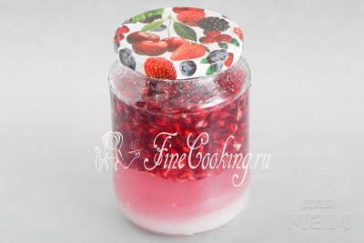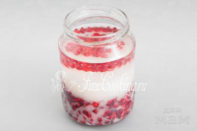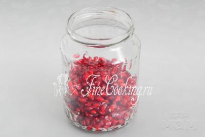 На следующем этапе приготовления домашнего гранатового ликера понадобится банка, емокстью как минимум 700-800 миллилитров. Хорошенько моем ее и споласкиваем. Закладываем в банку зерна граната, которые при желании можно слегка потолочь, но это вовсе не обязательно.