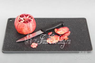 Вначале нужно разобрать гранат. Для этого берем красивый крупный плод, моем его и обсушиваем. После этого острым ножом срезаем шапочку и нижнюю часть фрукта таким образом, чтобы оголились зернышки. Для чего это нужно? Вся суть заключается в следующем: на срезе вы увидите, где именно находятся светлые перегородки, по которым можно без проблем разобрать весь гранат.