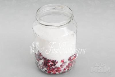 Засыпаем гранатовые зерна стаканом сахарного песка.