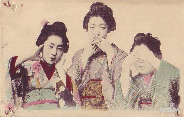 Три обезьяны первоначально связаны с одним из японских народных верований — Косин. Имея в своей основе китайский даосизм, вера Косин относительно проста: один из главных постулатов состоит в том, что в каждом человеке «живут» три некие сущности-наблюдателя («червя»), собирающие на своего хозяина компромат и регулярно во время его сна отправляющиеся с докладом к Небесному Владыке. Последователю культа во избежание больших неприятностей требуется всячески воздерживаться от зла, а не преуспевшим в этом, чтобы эти внутренние информаторы не смогли вовремя передать «в центр» нечто неблаговидное, в расчетное время «сеансов» (обычно раз в два месяца) нужно воздерживаться от сна, проводить бдения.