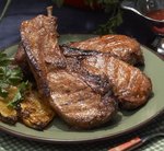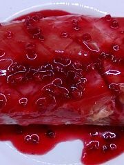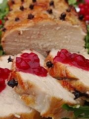 Готовое мясо выложить на блюдо. Украсить по желанию. К блюду подать клюквенный соус.
