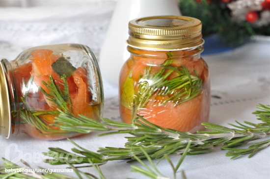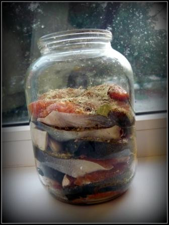 горошком и лавровый лист,уложила ломтики в баночку и залила оливковым
