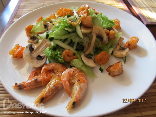 Салат с креветками, кальмарами, оливками и кукурузой.Ингредиенты:
