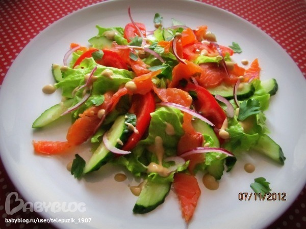 Простой, нежный салатик) Нарезать кубиками малосольный лосось, свежий огурец и варёное яйцо, посолить и заправить сметаной.