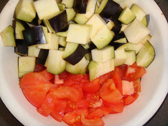 перекладываем в холодную воду и снимаем кожу. Нарезаем помидоры и