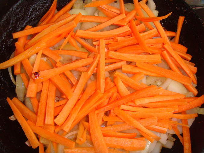 масла,закинули лук,слегка обжарили(не до корич.цвета)закинули морквь и