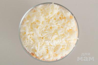 Вторым слоем кладем пушистый тертый сыр, не прижимая его.