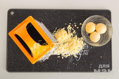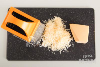 Любой твердый или полутвердый сыр (я использую Российский, 150 граммов) натираем на мелкой терке. Только не той, что для драников, а просто самой мелкой, чтобы в результате получилась мельчайшая воздушная соломка из сыра.