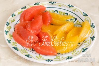 Дальше филетируем фрукты, то есть с помощью ножа вырезаем каждую дольку. При этом ломтики должны быть совершенно лишены белых прожилок.