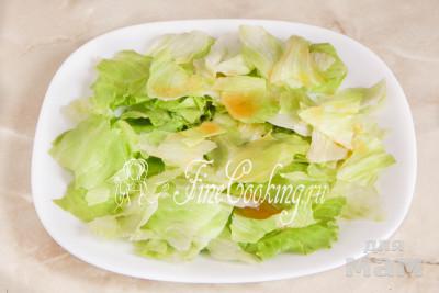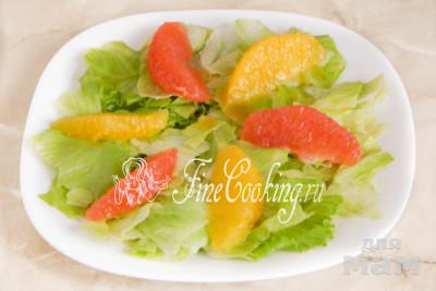 Теперь можно собирать салат. На тарелку кладем салат и поливаем его частью цитрусовой заправки.