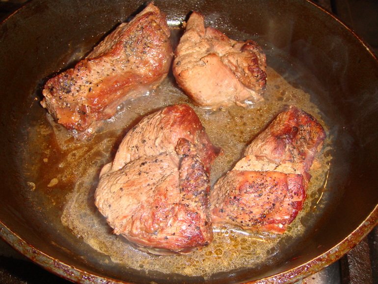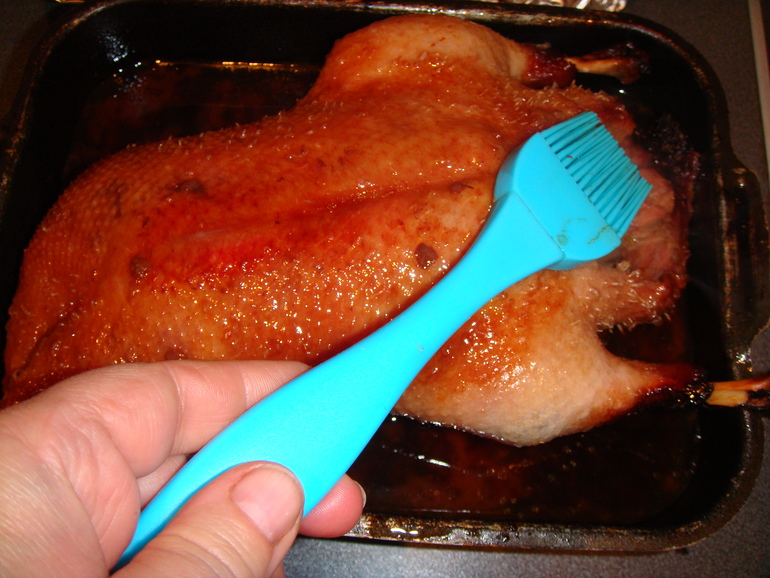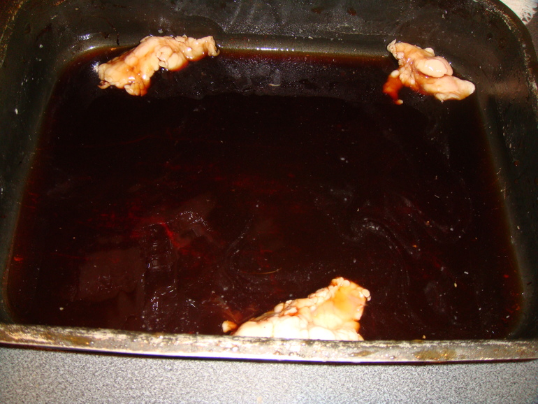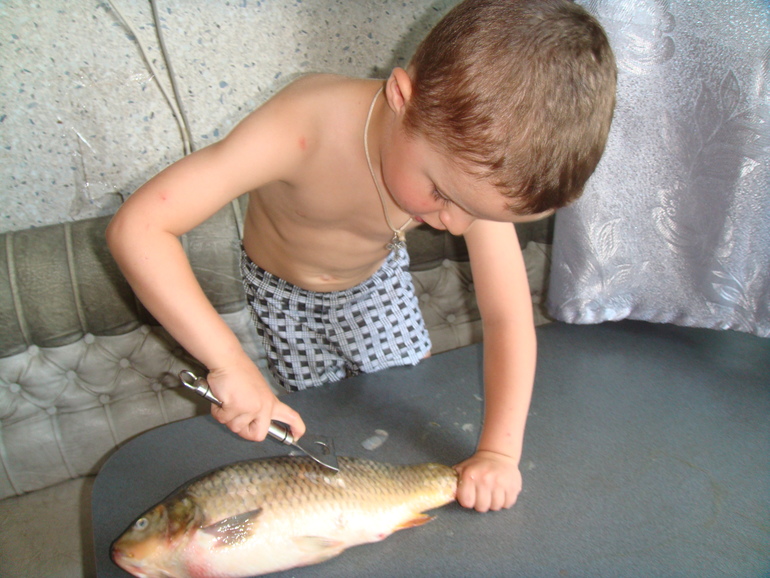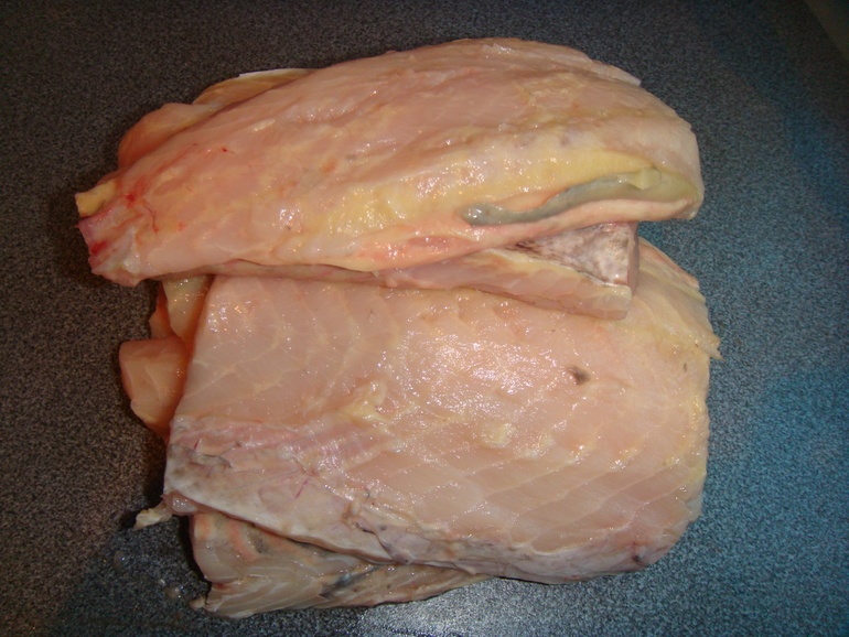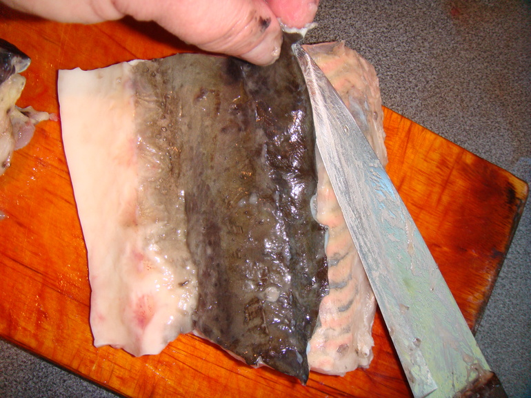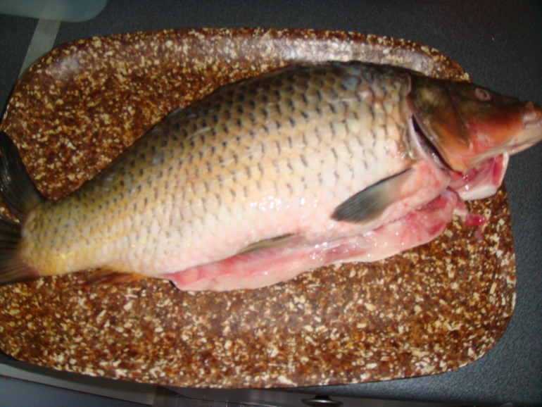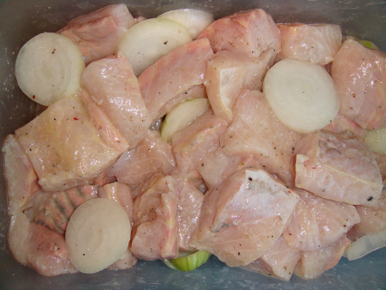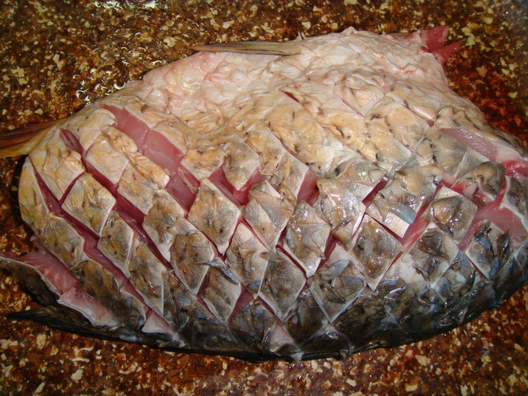 Шашлык из осетра Осетры у нас по акции во всех крупных супермаркетах. По карте вообще по 299 рублей!!! Поэтому покупаем часто: Почистить, помыть, вынуть жабры, глаза. Отрезать голову, хвост:Срезать филе с кожи:Вырезать хребет:Нарезать порционно для шашлыков:Поперчить, посолить, переложить в контейнер с репчатым луком:Залить маринадом из лимонного сока, растительного масла и смеси перцев:Перемешать, мариновать пару часов. Готовили в этот раз в электрошашлычнице:Через 15 минут:Очень нежно и вкусно:Карп без костей Рецепт спросила в китайском ресторанчике, уж очень мне понравилось, что любимый мной карп целый, но без костей! Итак, чистим от чешуи и внутренностей карпа: Вынимаем глаза и жабры, промываем: Я отрезала на уху голову и хвост, но можно их оставить. Сделать острым ножом много параллельных глубоких надрезов с обеих сторон: Натереть карпа солью с перцем и сметаной, положить в сотейник: Запекать в духовке при температуре 180 градусов 60 минут: (фото не восстановилось после сбоя ББ :( ) Кости при такой готовке просто куда-то "растворяются"!!! А мясо сочное и красивое! "Нога динозавра" Собственно, это куски баранины под шубкой. Баранина нужна большими кусками:Срезать порционные куски с костей (по 250-300 г на порцию):Быстро обжарить в раскаленном масле для запечатывания соков:Поставить баранину запекаться в духовку, прикрыв фольгой, на 40-50 минут (до мягкости), можно добавить немного воды:Приготовить 100 г орехов (у меня фисташки и фундук), головку чеснока, 50 г сухарей:Смолоть все в блендере:Должна получиться вот такая крошка:Приготовить намазку: растительное масло, горчица, соль, тархун:Вытащить мясо из духовки, распределить намазку:Сверху разложить крошки - шубку (приминать руками):Быстро запечь до зарумянивания:Шубка впитывает в себя все соки из мяса. Такая вкусняшка получается! Съели ее раньше мяса:Медовая утка Выпотрошить утку, вынуть внутренности, срезать лишний жир (он нам пригодится), обсушить тушку. Смешать пол стакана меда, пол стакана соевого соуса и пол стакана коньяка: Обмазать утку со всех сторон соусом (влить и внутрь тоже): Закрыть фольгой и поставить на ночь в холодильник. Перевернуть утку и еще раз внутри и снаружи натереть соусом:Выдержать перед запеканием в холодильнике еще 3-4 часа. Запекать сначала грудкой вниз 40 минут под фольгой. Затем перевернуть грудкой вверх:Утка попалась мне в этот раз какая-то "не бритая" - российская. А я уже привыкла к идеально ощипанным венгерским и немецким, внимание обратила только при запекании. Пришлось пинцетом ликвидировать лохматость уже во время готовки). Запекать еще 30-40 минут, постоянно смазывая соусом:Замечательно румяная утка получается:Разделать на порционные куски, подавать с рисом, полив карамелизированным соусом:Пока дописала - слюной изошла от воспоминаний. Пробуйте обязательно!