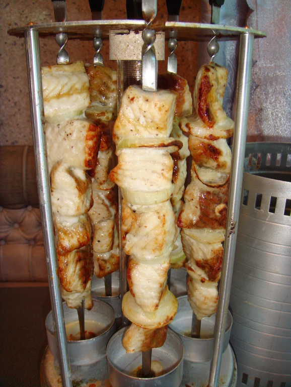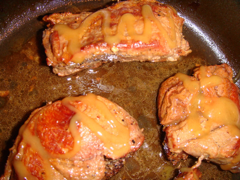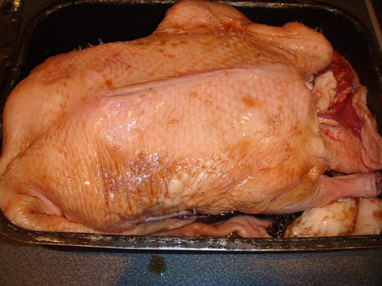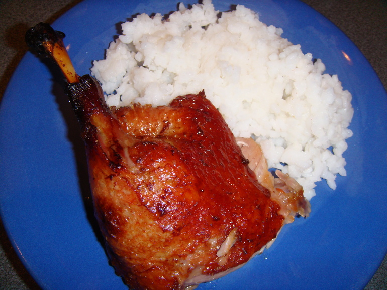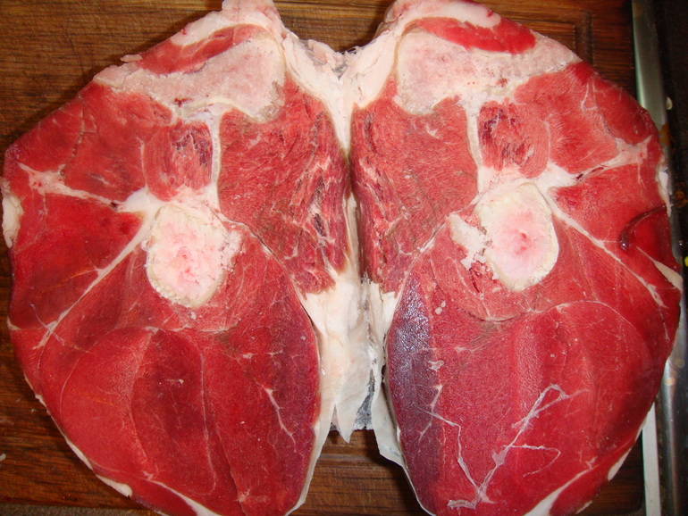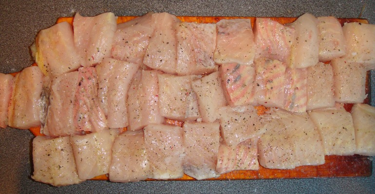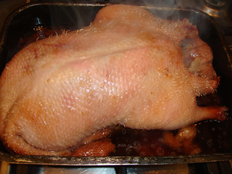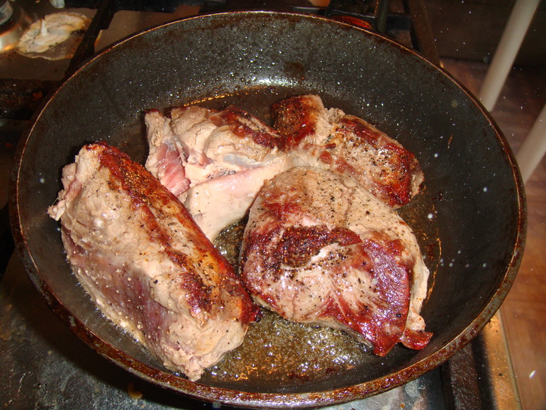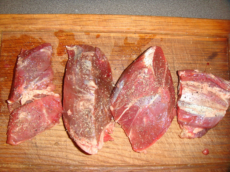 Шашлык из осетра Осетры у нас по акции во всех крупных супермаркетах. По карте вообще по 299 рублей!!! Поэтому покупаем часто: Почистить, помыть, вынуть жабры, глаза. Отрезать голову, хвост:Срезать филе с кожи:Вырезать хребет:Нарезать порционно для шашлыков:Поперчить, посолить, переложить в контейнер с репчатым луком:Залить маринадом из лимонного сока, растительного масла и смеси перцев:Перемешать, мариновать пару часов. Готовили в этот раз в электрошашлычнице:Через 15 минут:Очень нежно и вкусно:Карп без костей Рецепт спросила в китайском ресторанчике, уж очень мне понравилось, что любимый мной карп целый, но без костей! Итак, чистим от чешуи и внутренностей карпа: Вынимаем глаза и жабры, промываем: Я отрезала на уху голову и хвост, но можно их оставить. Сделать острым ножом много параллельных глубоких надрезов с обеих сторон: Натереть карпа солью с перцем и сметаной, положить в сотейник: Запекать в духовке при температуре 180 градусов 60 минут: (фото не восстановилось после сбоя ББ :( ) Кости при такой готовке просто куда-то "растворяются"!!! А мясо сочное и красивое! "Нога динозавра" Собственно, это куски баранины под шубкой. Баранина нужна большими кусками:Срезать порционные куски с костей (по 250-300 г на порцию):Быстро обжарить в раскаленном масле для запечатывания соков:Поставить баранину запекаться в духовку, прикрыв фольгой, на 40-50 минут (до мягкости), можно добавить немного воды:Приготовить 100 г орехов (у меня фисташки и фундук), головку чеснока, 50 г сухарей:Смолоть все в блендере:Должна получиться вот такая крошка:Приготовить намазку: растительное масло, горчица, соль, тархун:Вытащить мясо из духовки, распределить намазку:Сверху разложить крошки - шубку (приминать руками):Быстро запечь до зарумянивания:Шубка впитывает в себя все соки из мяса. Такая вкусняшка получается! Съели ее раньше мяса:Медовая утка Выпотрошить утку, вынуть внутренности, срезать лишний жир (он нам пригодится), обсушить тушку. Смешать пол стакана меда, пол стакана соевого соуса и пол стакана коньяка: Обмазать утку со всех сторон соусом (влить и внутрь тоже): Закрыть фольгой и поставить на ночь в холодильник. Перевернуть утку и еще раз внутри и снаружи натереть соусом:Выдержать перед запеканием в холодильнике еще 3-4 часа. Запекать сначала грудкой вниз 40 минут под фольгой. Затем перевернуть грудкой вверх:Утка попалась мне в этот раз какая-то "не бритая" - российская. А я уже привыкла к идеально ощипанным венгерским и немецким, внимание обратила только при запекании. Пришлось пинцетом ликвидировать лохматость уже во время готовки). Запекать еще 30-40 минут, постоянно смазывая соусом:Замечательно румяная утка получается:Разделать на порционные куски, подавать с рисом, полив карамелизированным соусом:Пока дописала - слюной изошла от воспоминаний. Пробуйте обязательно!