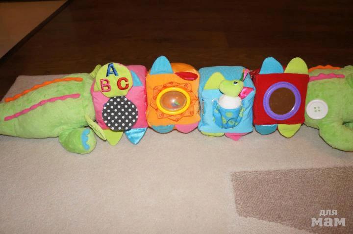 Этот забавный мягкий Крокодил состоит из отдельных головы и хвоста, и 4 больших кубиков с различными развивающими игрушками и сюрпризами. Малыш будет развивать творческое мышление, ведь Крокодила можно собирать в любой комплектности – голова + хвост, голова + 2 кубика + хвост и т.д. Внутри каждой лапки крокодила находится пищалка, в хвосте - погремушка. За цветочек на хвосте можно потянуть, он будет забавно вибрировать и греметь, возвращаясь в исходное положение. На голове у крокодила есть 2 большие пуговицы, а на хвосте - 2 большие петельки. Их можно застёгивать, тогда у малыша получится очаровательный маленький крокодильчик. 4 мягких кубика выполнены из ткани с различной фактурой. У каждого кубика две шуршащие грани и цифры от 1 до 4, а также развивающие игрушечки: 1) На 1-м – зеркальце диаметром 6,5 см (травмобезопасная зеркальная поверхность); 2) На 2-м – кармашек с маленьким крокодильчиком, только вылупляющимся из яйца, привязанный к кубику веревочкой; 3) На 3-м – прозрачный пластиковый роллер с цветными рыбками внутри (можно покрутить и погреметь); 4) На 4-м – две тканевые странички для листания, в одной пищалка, в другой шуршалка, а под ними – прозрачный пластиковый кармашек, куда можно вложить фотографию малыша и играть в прятки! Одна страничка с черно-белыми узорами. Дополнительная информация: Материал: полиэстер. Длина игрушки: 119 см. Размер кубика: 13х13х14 см. Яркая ткань игрушки и различная фактура материала будут способствовать развитию моторики. Занимательная игра поощряет детскую любознательность. Малышу очень понравится яркий развивающий центр, с которым он не захочет расставаться!