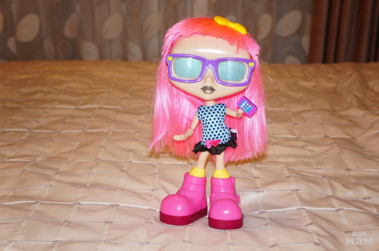 Очень эффектный внешний вид. Ярко-розовые волосы с прямой челкой, красивые очки, устойчивые ботинки и оригинальное платье в горошек либо сердечко Интерактивная кукла Гэбби имеет необычные очки, которые оснащены сенсорной системой, которая позволит вам использовать ее для игр. Они представляют собой два экранчика, которые показывают около 500 изображений (выражения глаз, картинки) Она очень устойчивая и не требует опоры Кукла может говорить по-русски: знает больше 300 слов, умеет задавать вопросы и отвечать Она умеет писать СМСки и говорить по телефону Включите музыку и увидите, как интерактивная кукла Габби танцует В комплекте есть инструкция на русском языке Работает не батарейках Для игр можно использовать специальное приложение для телефонов. Его можно сказать бесплатно в App Store и Google play. В приложении предусмотрено до 25 игр с куколкой В комплекте есть аксессуары для причесок (заколки, расческа), а также интерактивные игрушки (телефон, кекс, напиток, собака, губная помада, тени для век) Кнопка включения находится на подошве одного из ботинок Губы представляют собой сенсорную кнопку. Она реагирует на интерактивные аксессуары На голове имеется кнопка КАК ИГРАТЬ: Мыльные пузыри. Касайтесь на очках кнопок в виде сердца для того, чтобы помочь ловить пузыри Икота. Пока не закончилось отведенное время, необходимо касаться губ в тот момент, когда они становятся зелеными Спутанные волосы. Чтобы расчесать их, необходимо касаться сенсора на очках Поймай печенье. Чтобы оно не упало, необходимо вовремя подставить чашку с молоком Стрижка челки. Касайтесь соответствующего сенсора на очках, чтобы подстричь челку Музыкальный режим. Танцуйте в тот момент, когда кукла движется. Когда она замирает, останавливайтесь и вы Игра с тенями. Красьте их, нажимая на сенсоры очков Таинственный режим. Куколка будет задавать вам вопросы, а вы можете выбирать ответы, нажимая на кнопки на очках Удерживайте кнопку-губы куклы и вы услышите разные фразы Чтобы выбрать режим причесок, нажмите на голову Гэбби Если зазвонил телефон, нажмите на губы куклы, чтобы она ответила При помощи кекса можно накормить Габби, когда она голодна. Аналогичным образом можно напоить ее напитком.