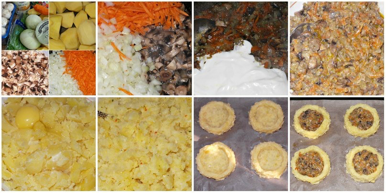 Ингредиенты: Картофель -10-11 шт Молоко - 50 мл Шампиньоны - 100г Морковь 1 шт Лук 2-3 шт Чеснок 2-3 зубчика Яйцо 1 шт Сметана - 2-3 ст.л на вкус Соль - на вкус Специи по вкусу Зелень - пучок Приготовление: Для начала нам следует почистить картофель и отварить его до готовности.Пока картофель варится, чистим и кубиками режем лук.Морковь чистим и трём на средней тёрки,чеснок чистим и выдавливаем,через чесночницу.Далее моем,чистим наши грибочки,и режим небольшими кубиками.Обжариваем грибочки, затем добавляем,морковь,лук,специи и чеснок,всё это перемешиваем и жарим при закрытой крышки,на маленьком огне,минут 10,добавляем нашу сметану ,и тушем ещё минут 10-15,до готовности.Пока наши грибочки готовятся,приступаем к картошки.Из картофеля мы готовим картофельное пюре, добавив в него молоко,соль,и один желток,всё это толчем в пюре.Смазываем противень растительным маслом,можно застелить бумагой,для выпечки,по желанию.Выкладываем готовое картофельное пюре так, чтобы получились "гнезда" - то есть с глубокой выемкой в середине.В середину выкладываем нашу начинку.Ставим в предварительно разогретую духовку на минут 15-20, так как все ингредиенты у Вас уже практически готовы.Ну вот наше замечательное блюдо и готово.Украшаем на свой вкус.Приятного аппетита!