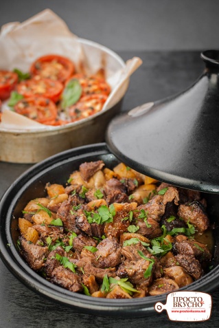Проверить мясо и снять его с костей. Нарезать его небольшими кусочками. Добавить в тажин нарезанный небольшими кусочками инжир и немного уварить соус. Крышкой не накрывать. Мясо вернуть в соус, перемешать и прогреть.