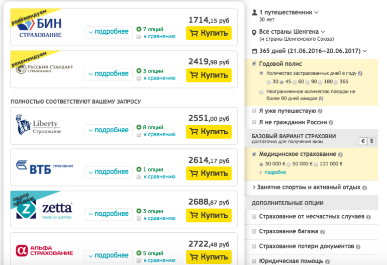 Сейчас я в процессе покупки страховки на ближайшую поездку на Майорку. Забиваю в поисковик свои даты и возраст, получаю список предложений: