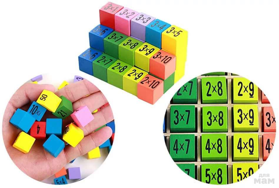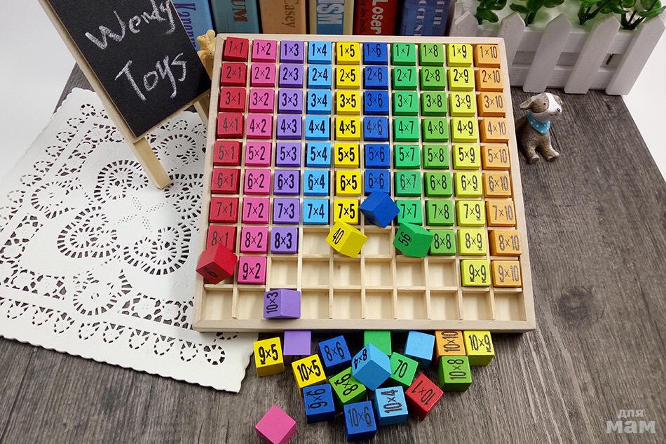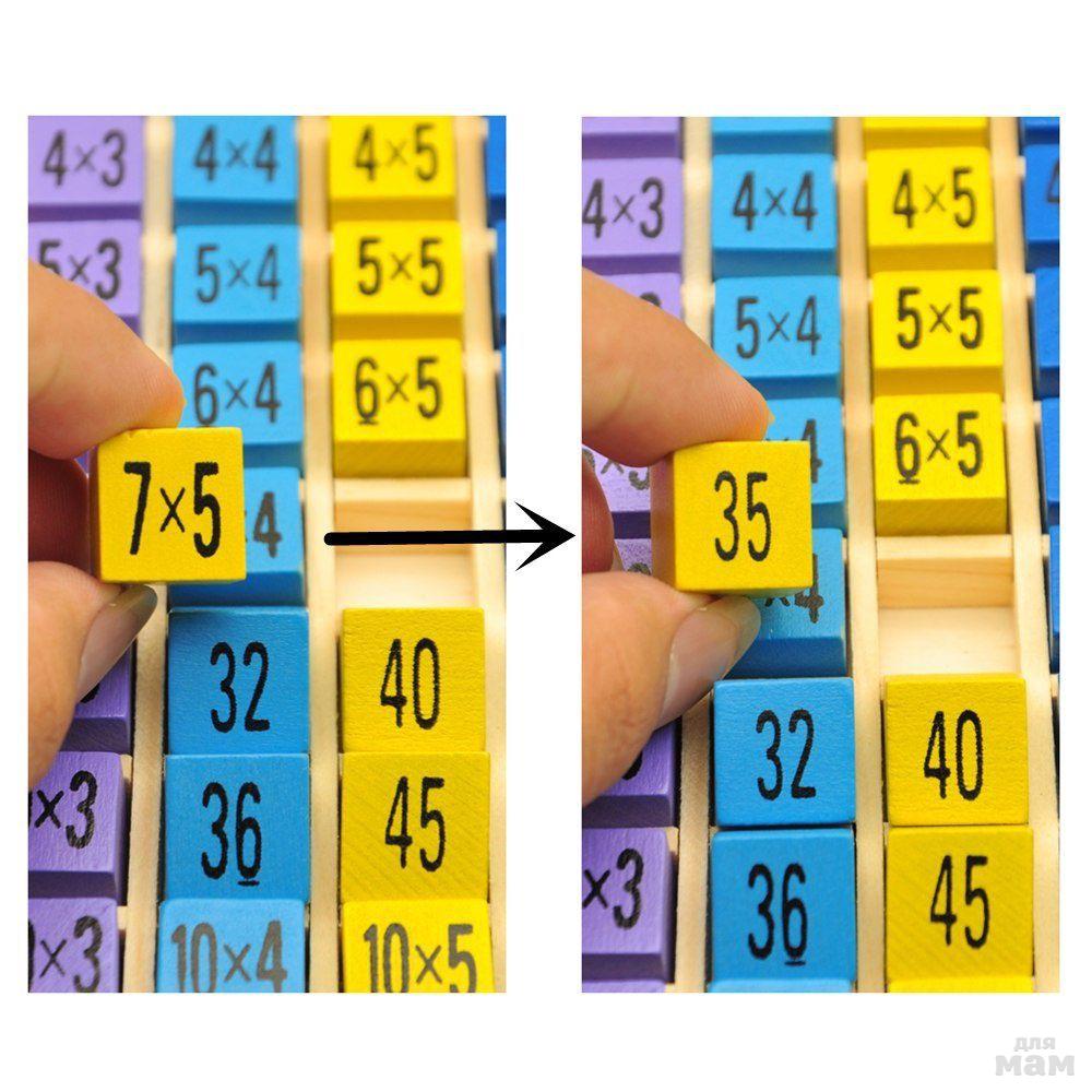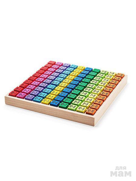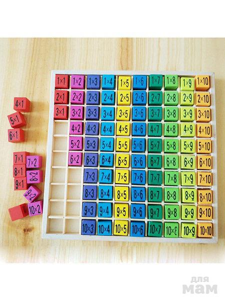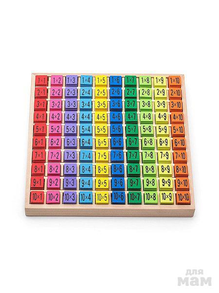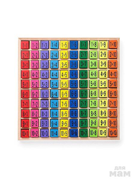 - игровое поле.Темыцифры и счет, цвета, математикаРазвиваемые навыкимоторика, память, внимательность, логикаМатериалдеревоАннотацияЯркий и полезный инструмент для изучения и запоминания метода умножения чисел, поможет ребятам быстро и легко освоить таблицу умножения. Визуальный цветовой ряд облегчает запоминание и восприятие данных. На фронтальной стороне кубиков нанесено уравнение, на обратной ответ. Деревянная таблица умножения это необходимый и качественный помощник для детей.