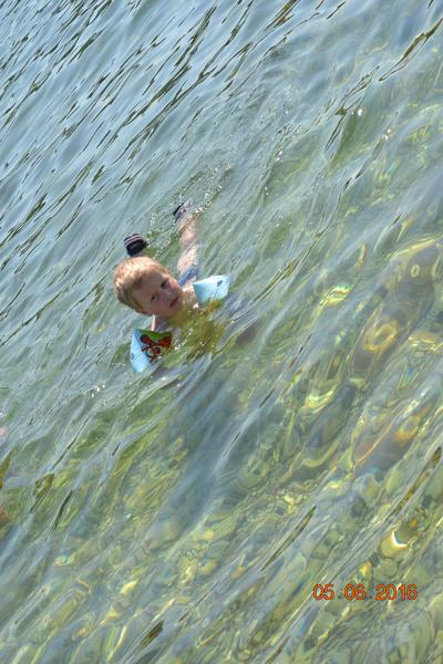 Прохор преодолел к концу страх глубины, это не в бассейне плавать и снать, что вот оно дно рядом))) В итоге нарукавники снял и поплыл