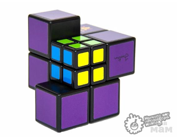 Большой одноцветный кубик 2х2 у которого вместо одного из элементов мини-кубик 2х2, но уже разноцветный! Перед вами не кубик 2х2, а экзотическая разновидность кубика Рубика 3х3, у которого есть центральные элементы - это внутренние углы мини-кубика, вокруг которых и крутятся элементы головоломки.