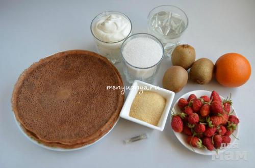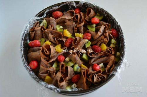 Нужно заранее напечь шоколадных блинов по указаным ингредиентам.Итак, для тортика понадобится 10 шоколадных блинов, фрукты-ягоды (у меня ушло 250 г клубники, три киви, один апельсин), форма разъемная 20-22 см и пищевая пленка.
