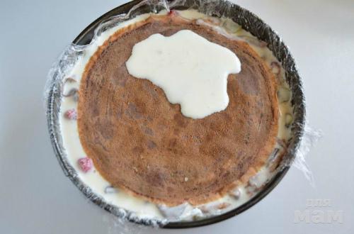 Разъемную форму застелите хорошо пищевой пленкой, чтобы борта тоже были прикрыты. Положите на дно первый блин, смажьте его кремом.