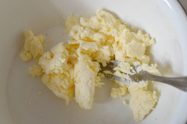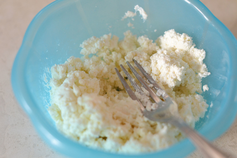 растираем вилкой, вбиваем яйцо, щепотку соли и 1/2 ч.л. соды. Перемешиваем,