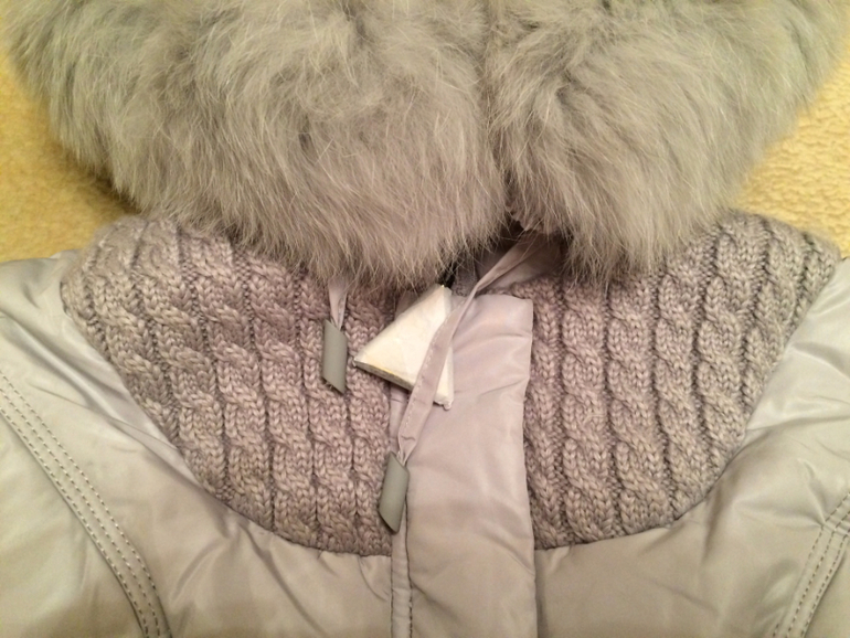 Мех на капюшоне и рукавах съёмный, вязанные рукава и вставка придают очень необычный вид.