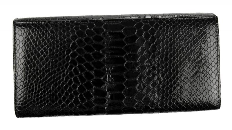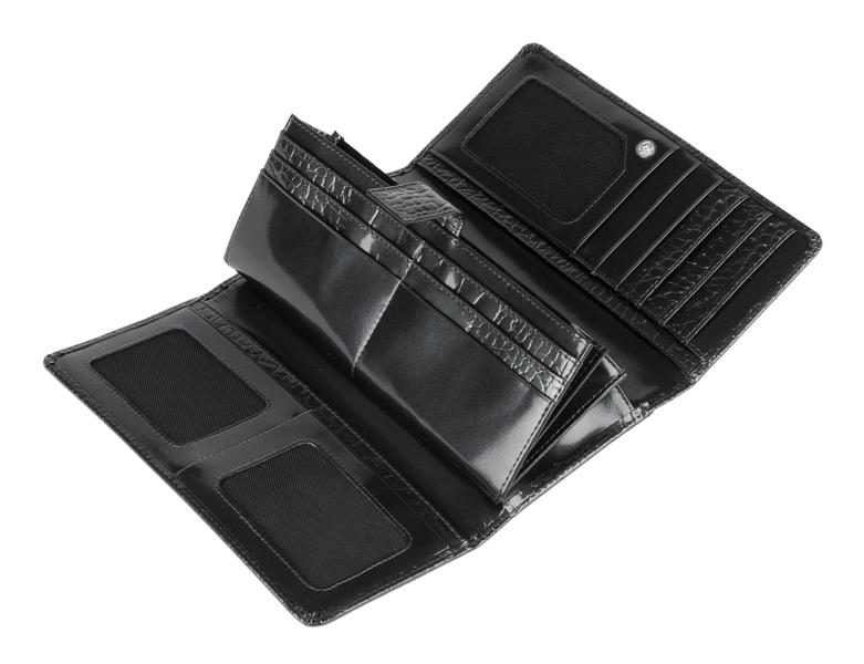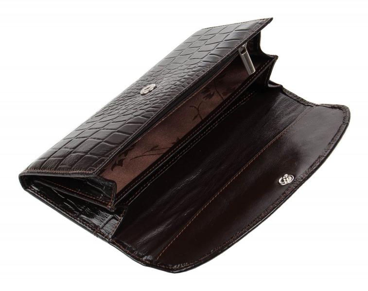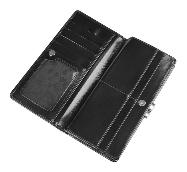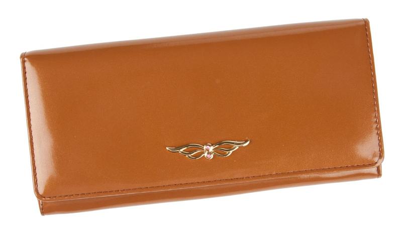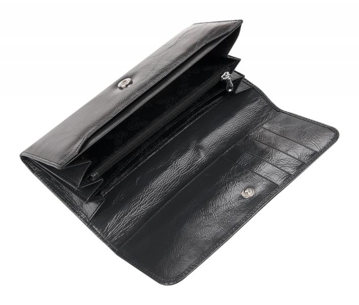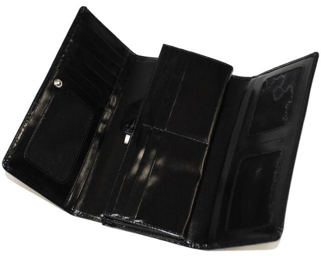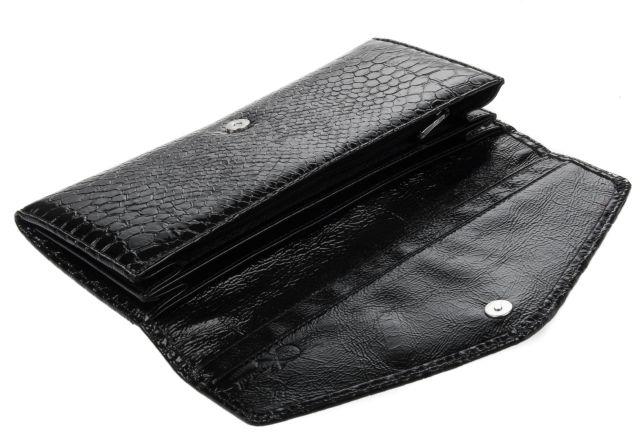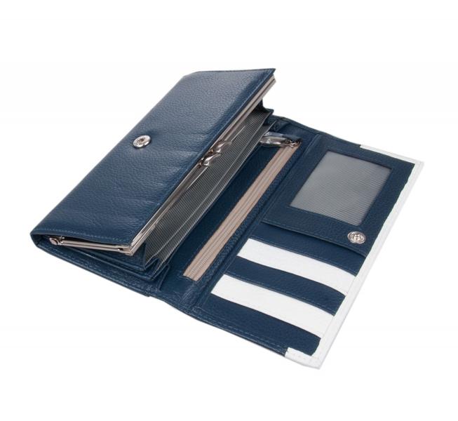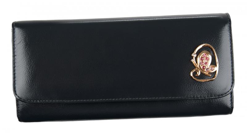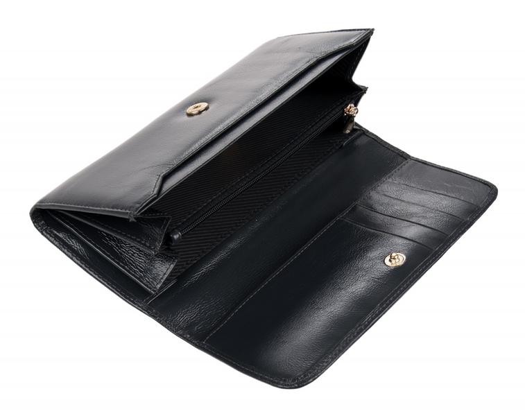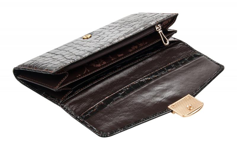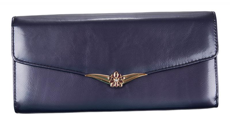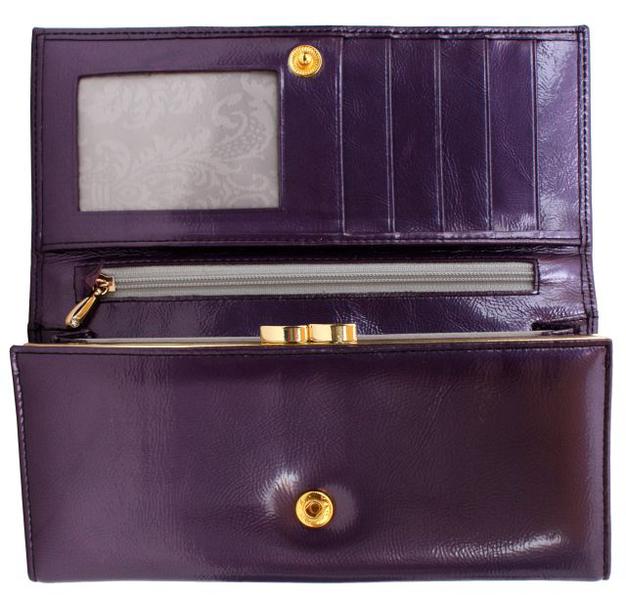 Портмоне женское на полную купюру.Внутри имеется 2 отделения для бумажных денег и дополнительно есть молния для металлических монет.Имеется не большая деловая часть для кредитных карт.Изделие закрывается клапаном на кнопке.