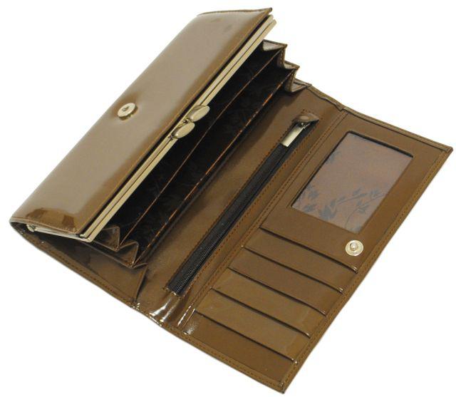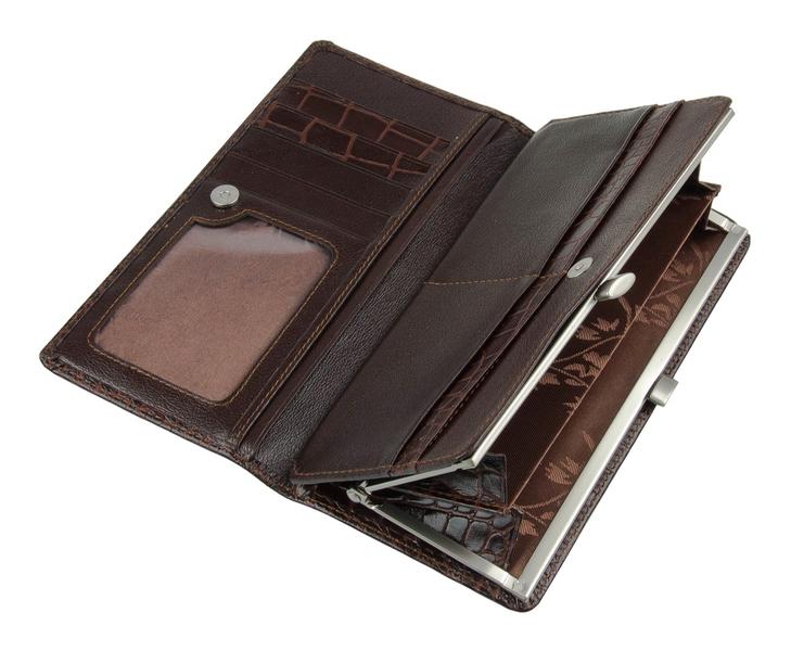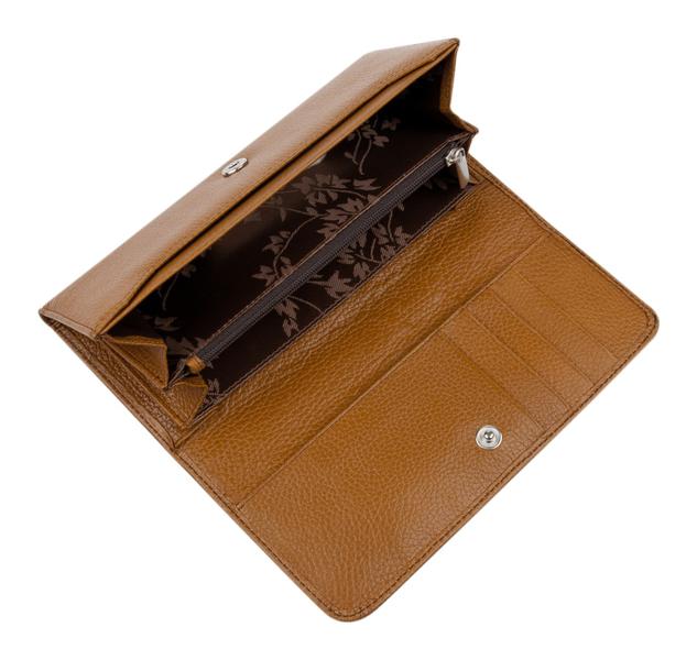 Снаружи открытый карман. Внутри несколько отделений для денег, монетница на "поцелуйчике", карманы для карт, бумаг, карман-сеточка. Откидной карман на ремешке с кнопкой, в нем карманы для карт, бумаг, два кармана-сеточки
