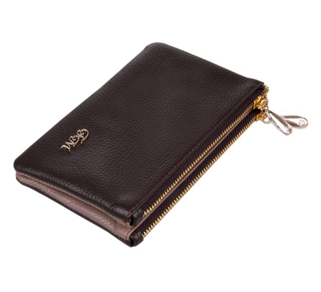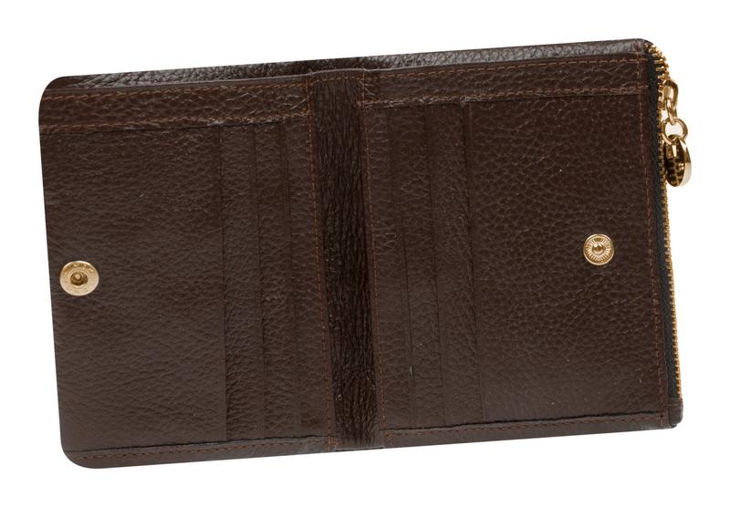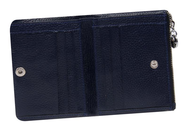 Портмоне в 2 сложения с цупферной застежкой, внутри 2 отделения для денег, с 2х сторон по 2 отделения для кредитных карт (с окошком), монетница закрывается на кнопку. Цена 2190 р