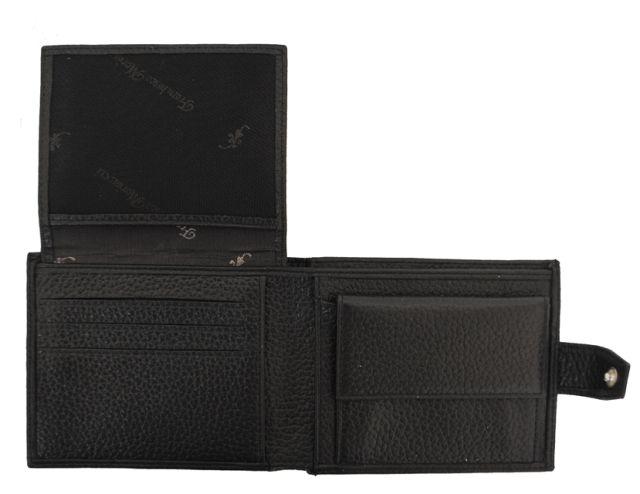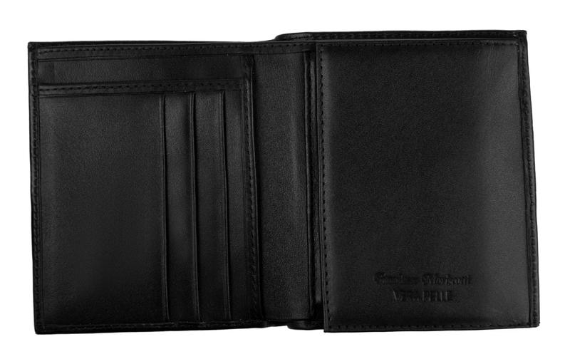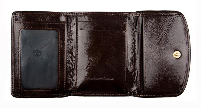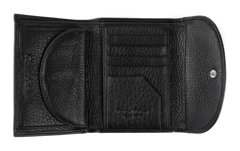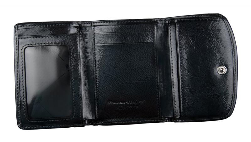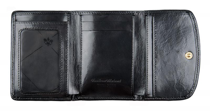 Портмоне Franchesco MariscottiПортмоне в два сложения, закрывается на клапан на кнопке. Внутри отделение для купюр с перегородкой. Слева - монетник на кнопке, справа - 4 кармана для визиток или кредитных карт, 2 кармана для бумаг и уголок для бумаг. Снаружи монетник на молнии.