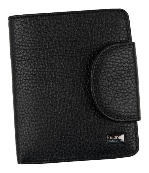 Портмоне AllianceСнаружи сзади открытый карман. Закрывается на кнопку. Внутри откидная панель с визитками и открытыми карманами. 3 отделения для купюр, карман на молнии.