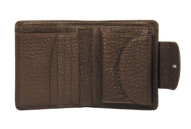 Портмоне в 2 сложения закрывается на кнопку. Внутри одно отделение для купюр, монетник на кнопке, 8 кармашков для кредиток, 3 кармашка для бумаг.