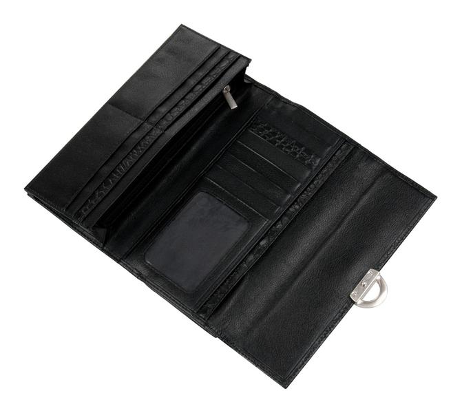 Портмоне закрывается клапаном на кнопку, внутри четыре отделения для купюр, четыре карманчика для заметок, на подклапане визитница состоящая из пяти карманчиков., потайной карманчик на молнии, монетница на рамочном замке,